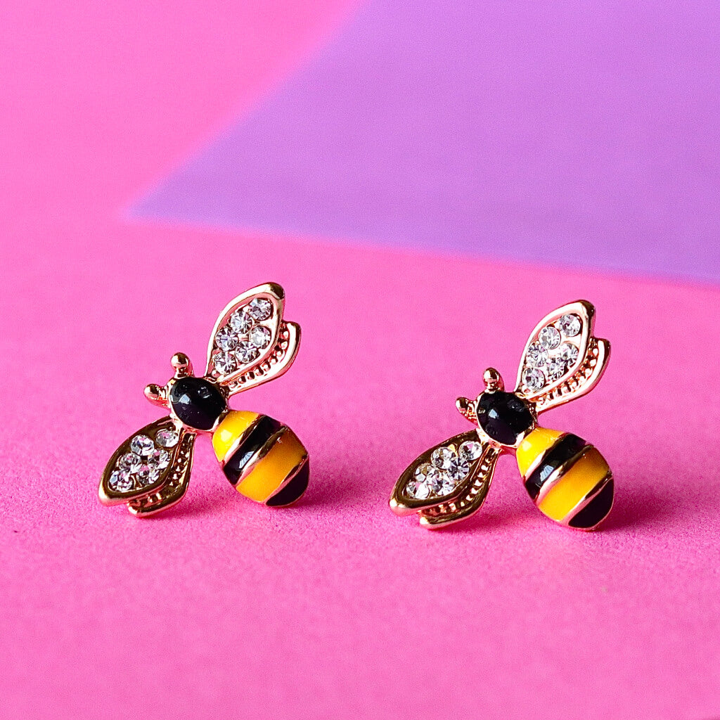 Design: A charming bee-shaped stud earring, featuring a detailed miniature bee with a black and yellow striped body. The wings are adorned with sparkling crystals, adding a touch of elegance.