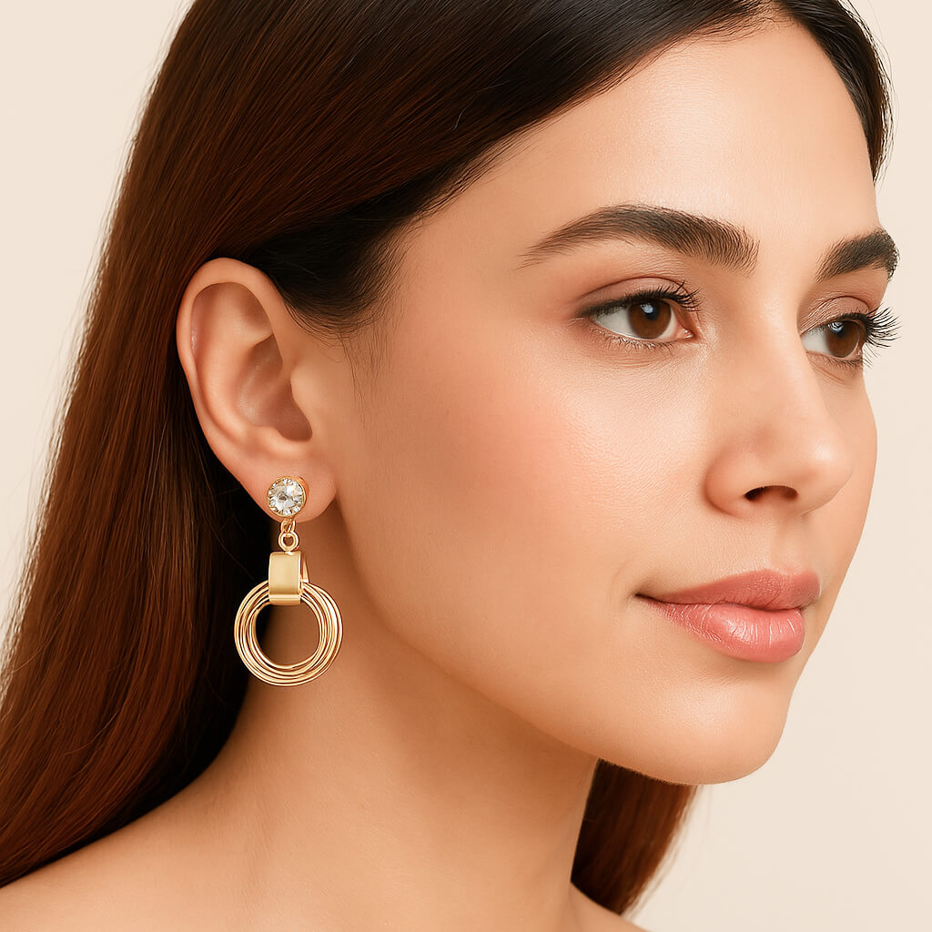 Sleek, structured, and radiating modern glam — the Glimmer Orbit Earrings blend geometric charm with just the right amount of sparkle. A brilliant crystal stud anchors the design, followed by a minimalist gold bar that gracefully connects to interlocked golden rings, creating a polished orbit effect that moves with you.
