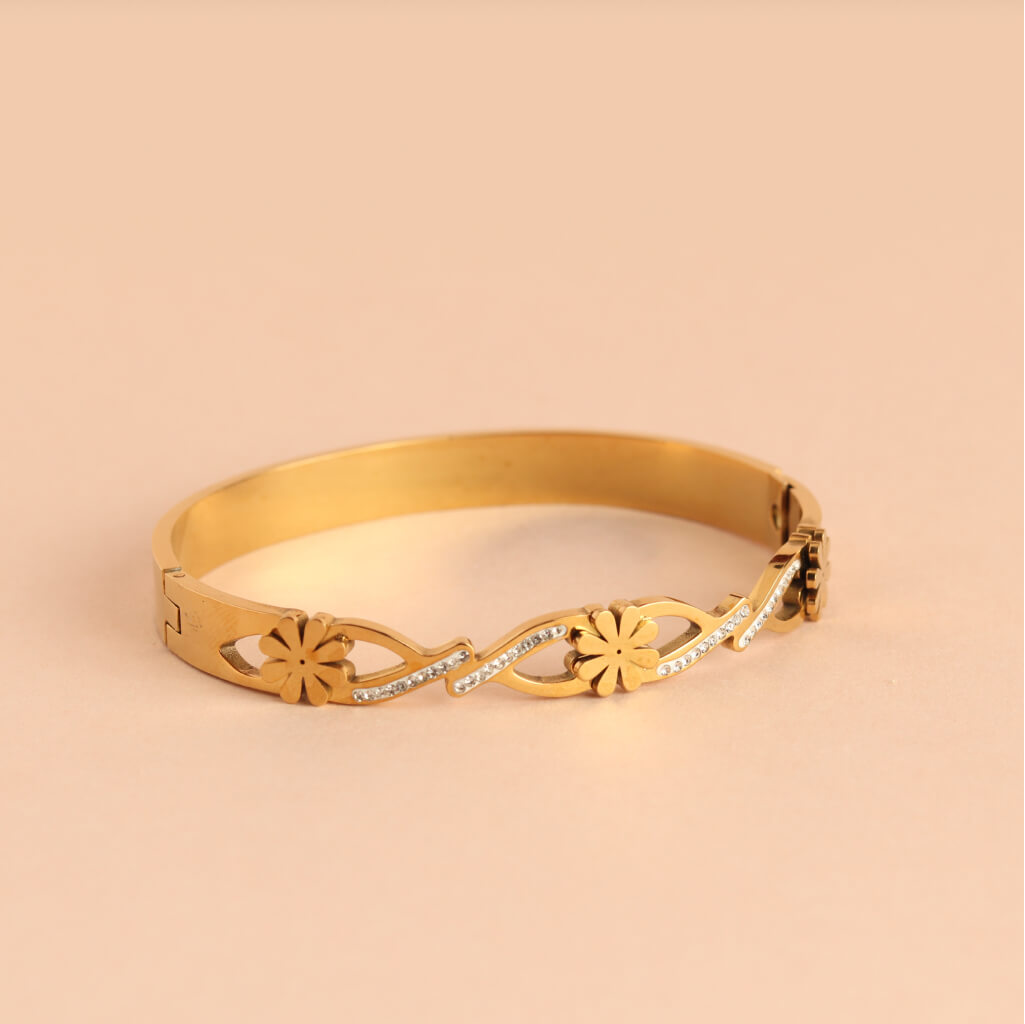 A delicate fusion of floral beauty and timeless elegance. The Gold Bloom Bracelet features twin flower motifs entwined with soft curves and shimmering stones, creating a graceful, feminine statement for any occasion.