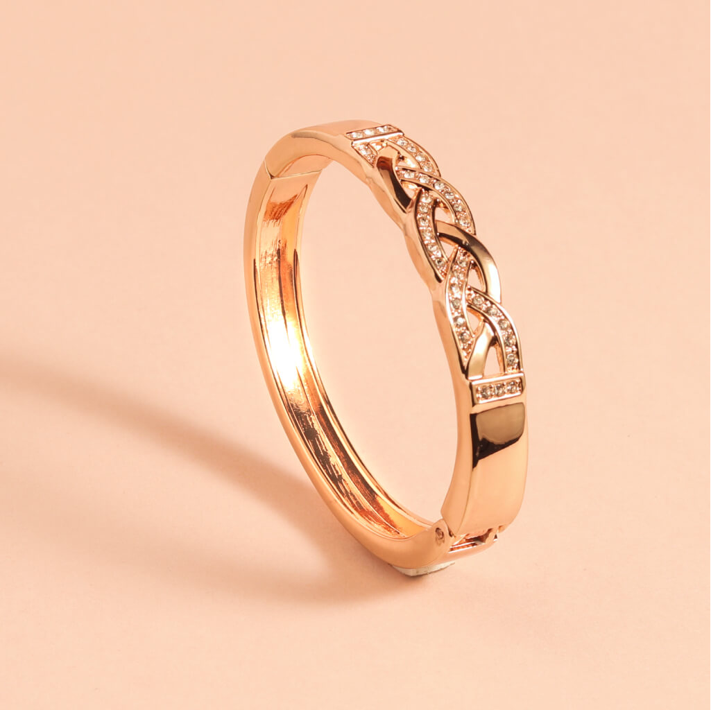 Add timeless elegance to your look with this gold bracelet featuring an intricate intertwined design adorned with shimmering crystals. The delicate braid pattern symbolizes connection and unity, making it not just a beautiful accessory but also a meaningful gift. Whether worn as a statement bangle for evening glamour or as a subtle sparkle to complement your day outfit, this bracelet is a versatile and stylish choice for any jewellery lover.
