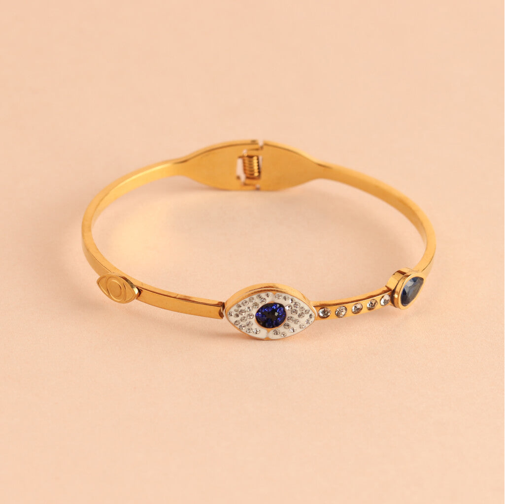 Embrace both style and symbolism with this gold evil eye bracelet, a stunning piece designed to offer charm, elegance, and protection. The centerpiece features the iconic evil eye motif, paved with sparkling cubic zirconia and accented by a striking deep blue crystal at the center. Flanked by additional crystal embellishments and a side-set blue gem, this bracelet effortlessly blends modern fashion with timeless meaning. Perfect for gifting or adding a touch of mystical glamour to your own collection.
