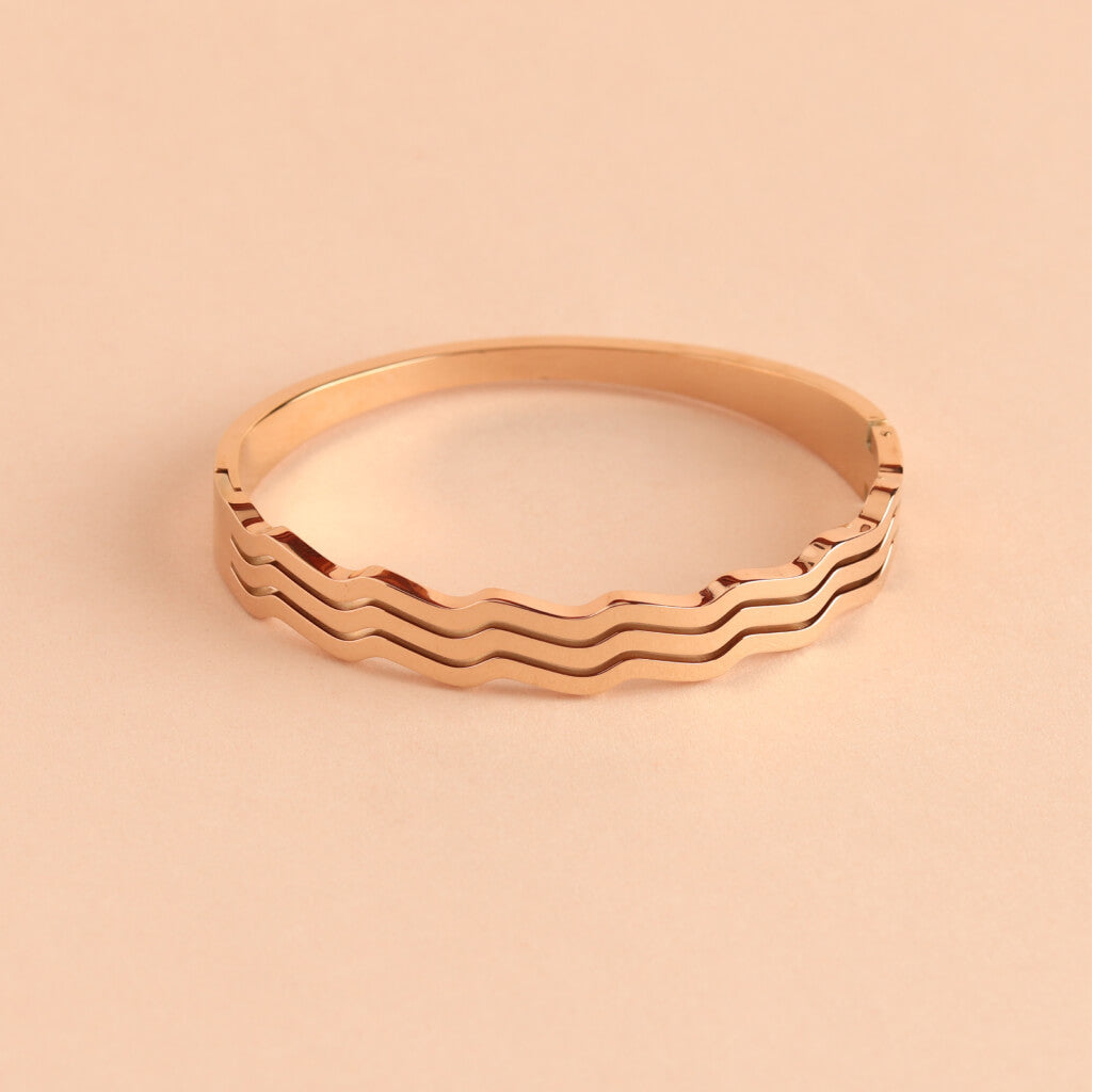 This gold bracelet brings a modern twist to timeless elegance with its unique triple wave design. Crafted in a warm gold-tone finish, the smooth, fluid curves create a striking silhouette that’s both minimalist and eye-catching. Perfect for stacking with other pieces or wearing solo for a sleek statement, it’s a versatile accessory for any wardrobe.