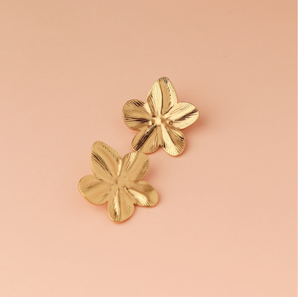 Bring a fresh floral charm to your look with these golden petal stud earrings, crafted in a textured five-petal design that feels elegant and timeless.
