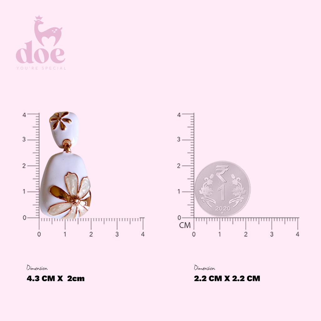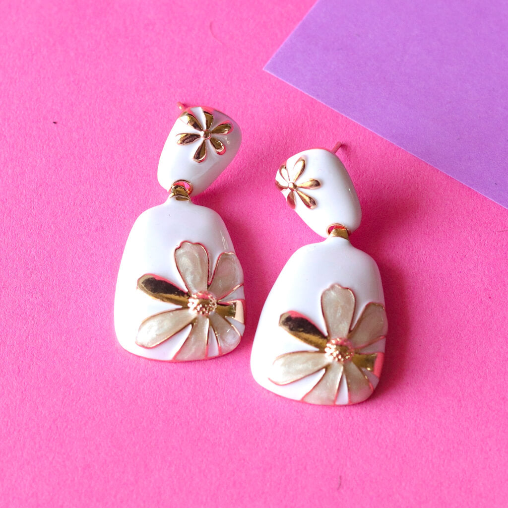These statement drops feature a smooth, ivory-toned surface crafted in gold-plated metal, adorned with daisy-like floral motifs that feel freshly picked from a sun-drenched forest clearing. Each earring blooms with petal-shaped gold overlays and shimmering accents that catch the light with every turn.