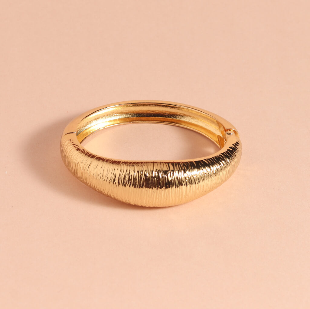 Elevate your jewelry collection with this textured gold stainless steel bracelet, a statement piece that perfectly blends elegance and durability. Designed with a bold, dome-shaped profile and a fine textured surface, this bangle reflects light beautifully, adding a touch of luxury to any outfit. Its timeless gold tone makes it versatile for both casual and formal occasions, while the high-quality stainless steel ensures long-lasting shine and wear resistance. Whether paired with evening gowns or everyday chic attire, this bracelet is sure to be a go-to favorite.