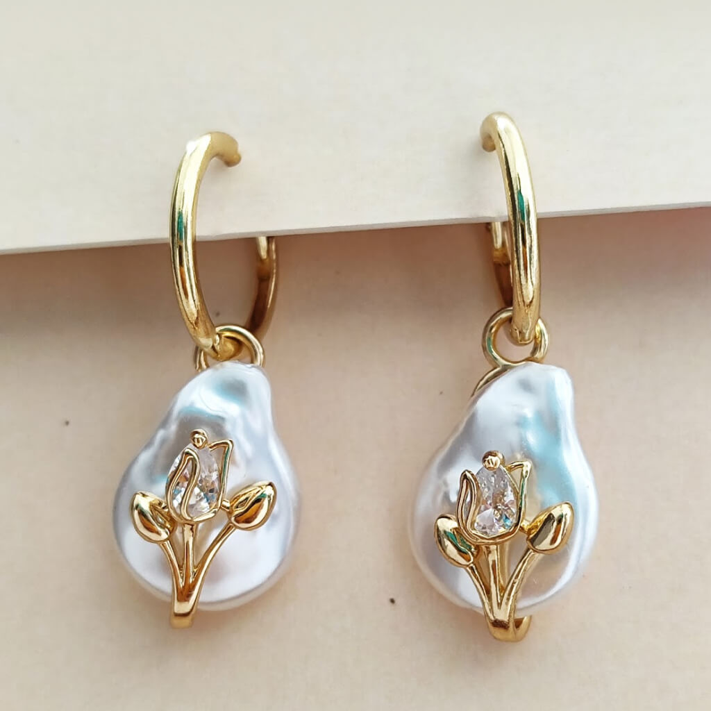 Let your elegance blossom with these stunning Pearl Drops. Featuring an irregular faux pearl drop cradled in a delicate tulip-shaped floral motif, this piece is a poetic blend of nature and shine. The lightweight golden hoop adds a timeless touch while the floral charm brings soft, romantic detail.
