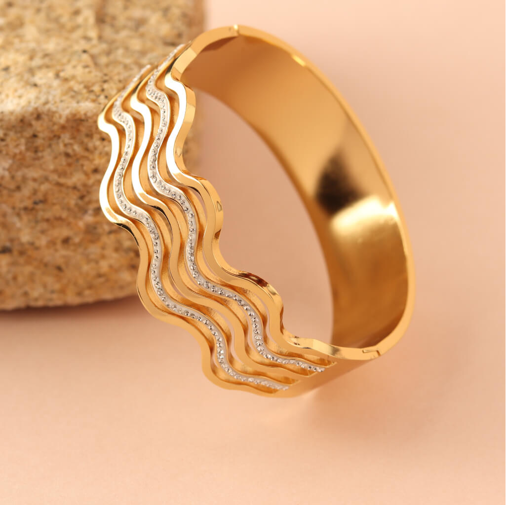 Catch the wave of elegance. This gold-plated bracelet features a stunning triple-wave design layered with fine zircon detailing — a modern statement piece that mirrors fluidity and strength.